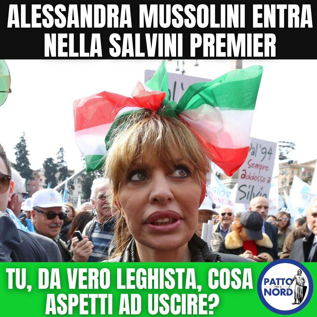 Il Patto per il Nord, organizzazione di leghisti della prima ora, guidata da Paolo Grimoldi, alla luce dell’adesione della Mussolini al Carroccio, in un post pubblicato sui social network accompagnato da una foto dell’ex parlamentare europea invita i veri leghisti ad uscire dalla Salvini Premier,