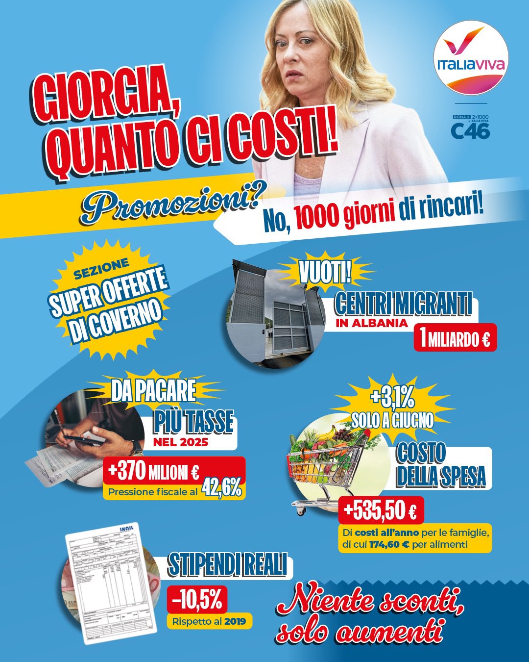 Giovedì 17 luglio saranno 1000 giorni del Governo Meloni. Mille giorni di promesse mancate, tasse aumentate, famiglie più povere. La Presidente del Consiglio continua a raccontare che va tutto bene. Ma la verità è che questo esecutivo sta impoverendo il Paese. Noi questi mille giorni li “festeggeremo” così: invito tutti gli amici di Italia Viva – e anche chi è semplicemente stanco di questo Governo – a organizzare in tutta Italia tavolini, banchetti, iniziative fuori dai supermercati con il nostro volantino: “Giorgia, ma quanto ci costi?.