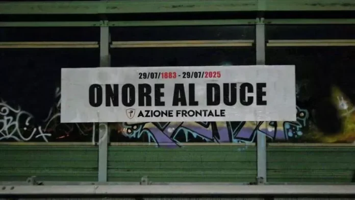 È comparso nella notte, su un cavalcavia del Grande Raccordo Anulare a Roma uno striscione con la scritta “Onore al Duce”, firmato da Azione Frontale. L’affissione è avvenuta nel giorno dell’anniversario della nascita di Benito Mussolini, il 29 luglio.