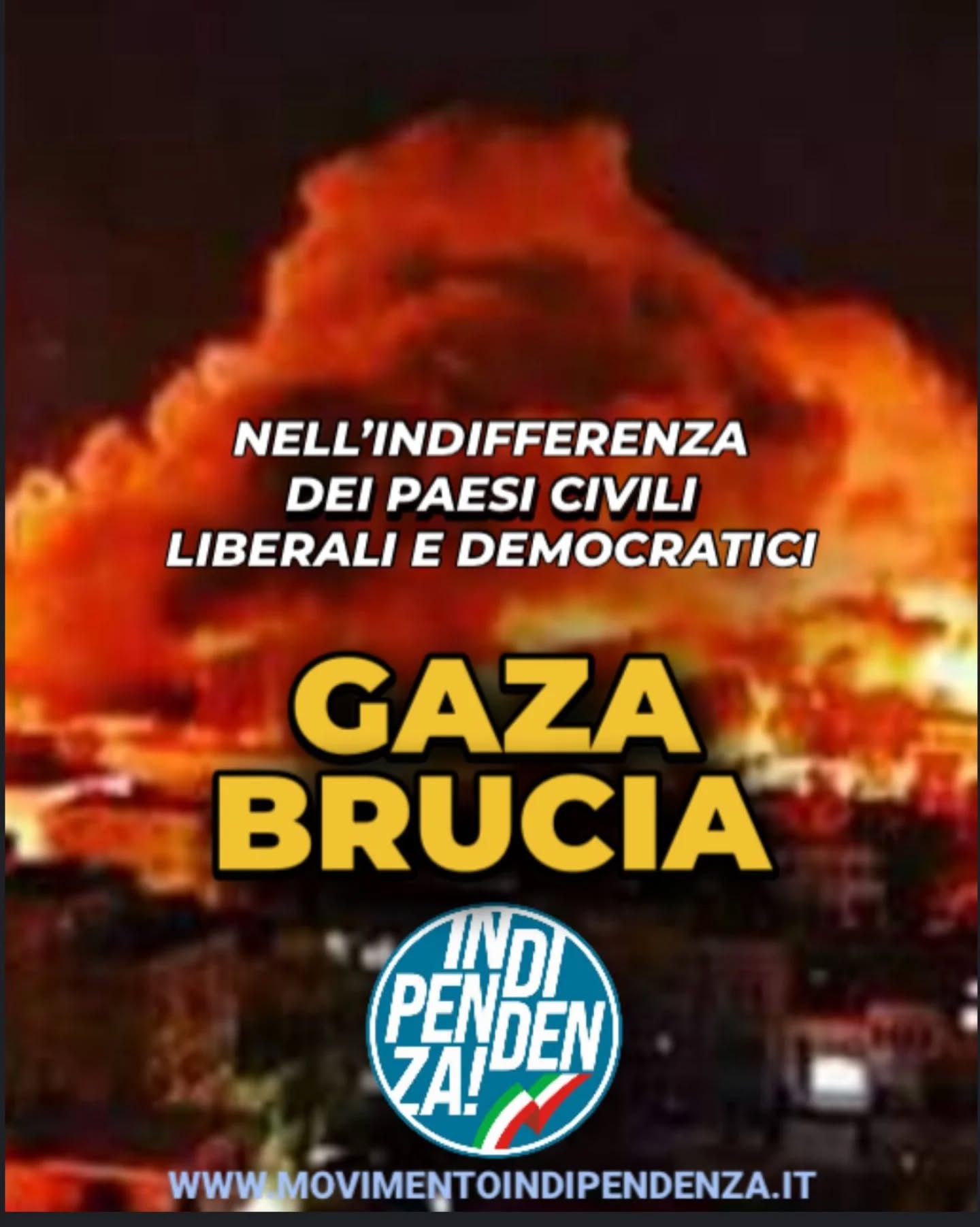 “Gaza brucia! E con Gaza brucia l’Occidente, muore la nostra civiltà, finisce l’inganno sulla superiorità morale dei vincitori della seconda guerra mondiale. Nel massacro dei bambini palestinesi, nelle fiamme delle loro case, nella disperazione di chi muore di fame il vero volto della società liberale. Stiamo assistendo alla cancellazione di un popolo e coloro che si ammantavano di democrazia e libertà sono rimasti a guardare. Nulla sarà più come prima, nessuno potrà tornare a chiederci di sentirci in colpa per la nostra storia: a Gaza gli israeliani hanno mostrato la loro vera identità!”