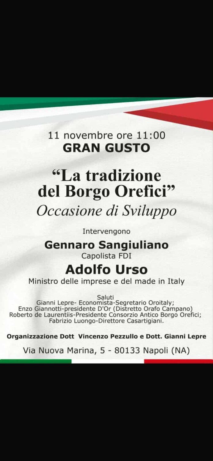 Domani, nella sala convegni di Gran Gusto a Via Marina, si terrà il dibattito su”La tradizione del Borgo Orefici-Occasione di sviluppo“. Ci sara’ la partecipazione del ministro delle imprese e del Made in Italy Adolfo Urso e del capolista di Fratelli d’Italia candidato al consiglio regionale, l’ex ministro Gennaro Sangiuliano. Interverranno per un saluto: Gianni Lepre-Economista, Enzo Giannotti– Presidente D’Or Campania, Roberto de Laurentiis-Presidente Consorzio Antico Borgo Orefici e Fabrizio Luongo– Segretario Casartigiani.