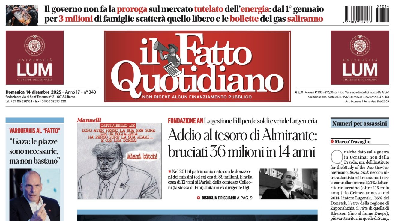 Addio al tesoro di Almirante: bruciati 36 milioni in 14 anni. Così titola in prima pagina Il Fatto Quotidiano nel numero di domenica 14 dicembre. Nell’articolo a forma dei colleghi Vincenzo Bisbiglia e Vanessa Riccardi si parla di un tesoro per metà dilapi dato, con un enorme punto interrogativo nei conti della cassaforte che finanzia la destra italiana.Spese legali, consulenze, incarichi, posti di lavoro, svalutazioni improvvise, tali da portare la Fondazione Alleanza Nazionale, l’ente nato dall’ eredità politica, economica, immobiliare del Movimento Sociale Italiano di Almirante e di AN di Gianfranco Fini a bruciare nel giro di 14 anni la bellezza di 36 milioni di euro di patrimonio a confronto degli 89,2 iscritti all’ atto di costituzione. Un tesoro composto dal finanziamento pubblico ai partiti (quando questi erano in vigore) tesseramenti, investimenti, donazioni da parte di ricchi simpatizzanti come per esempio la contessa Anna Maria Colleoni che dono’ una casa a Montecarlo al partito per sostenere quella che riteneva la buona battaglia.