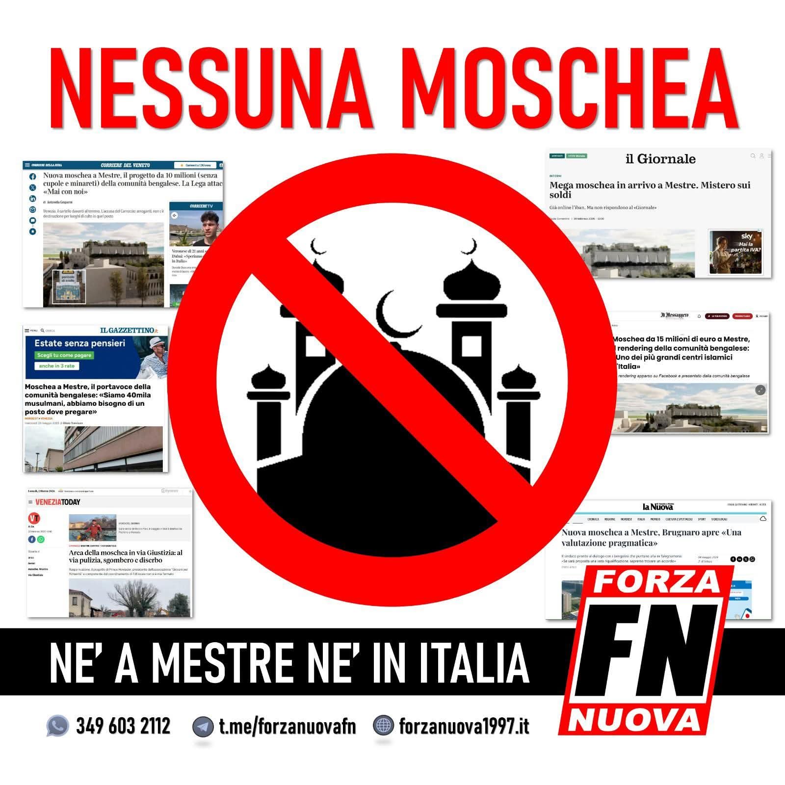 “Forza Nuova alza la voce e dice un NO secco alla maxi-moschea islamica da 1500 posti che la comunità musulmana vuole imporre in via Giustizia a Mestre! Basta con l’invasione islamica che avanza indisturbata sul nostro suolo sacro, basta con l’islamizzazione strisciante dell’Italia promossa da chi dovrebbe difendere la Patria!