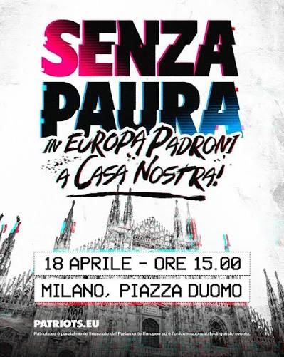 PADRONI A CASA NOSTRA! Riesumando in salsa europea, uno slogan di Umberto Bossi,s Lega ha organizzato per sabato 18 aprile in Piazza Duomo, a Milano, il grande evento dei Patrioti europei, con i nostri alleati e tanti leader da tutta Europa.Per difendere i valori dell’Occidente, la nostra cultura, le nostre tradizioni, i nostri confini.